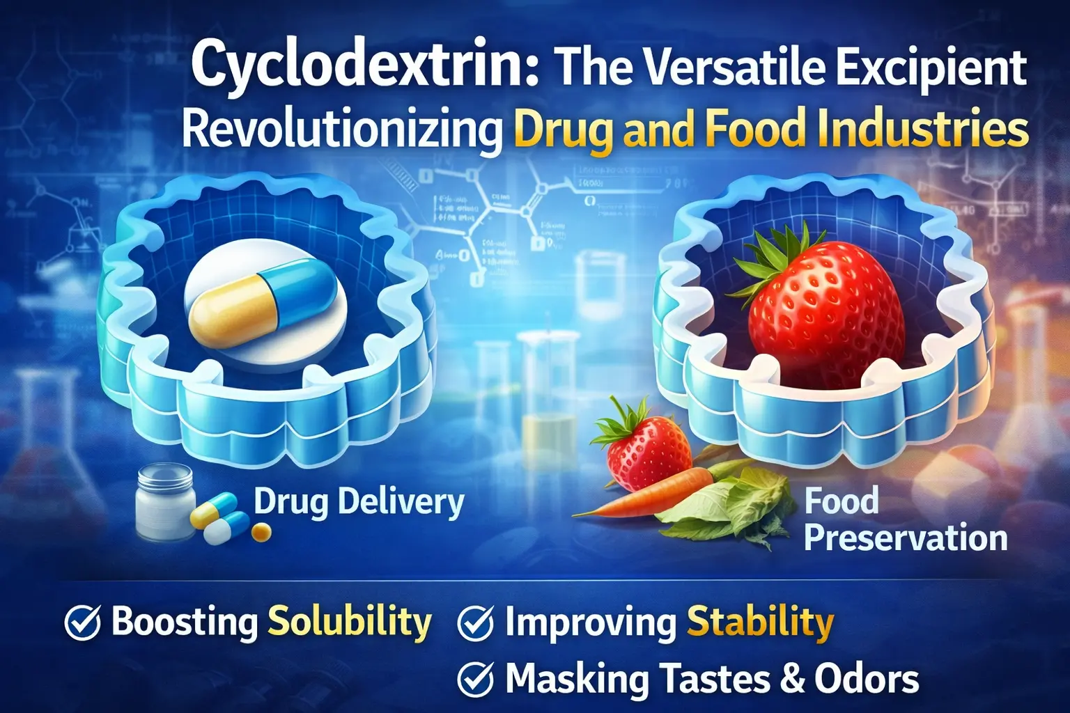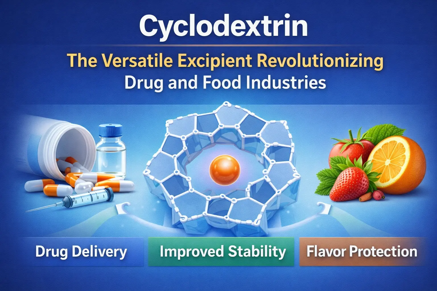 Panemuan cyclodextrin minangka salah sawijining langkah paling penting ing sejarah panganan lan obat-obatan. Oligosakarida siklik sing alami iki wis ngganti cara ngirim obat, njaga panganan seger, lan nggunakake akeh bahan kimia liyane ing industri. Pruduct nggawe kompleks inklusi sing ngatasi masalah penting ing pirang-pirang lapangan amarga struktur molekul sing khas, sing nduweni rongga njero hidrofobik lan permukaan njaba hidrofilik. Eksipien fleksibel iki ngganti ilmu formulasi lan proses manufaktur ing saindenging jagad. Bisa nindakake kabeh saka nambah panyerepan obat kanggo ndhelikake rasa ala ing obat-obatan.