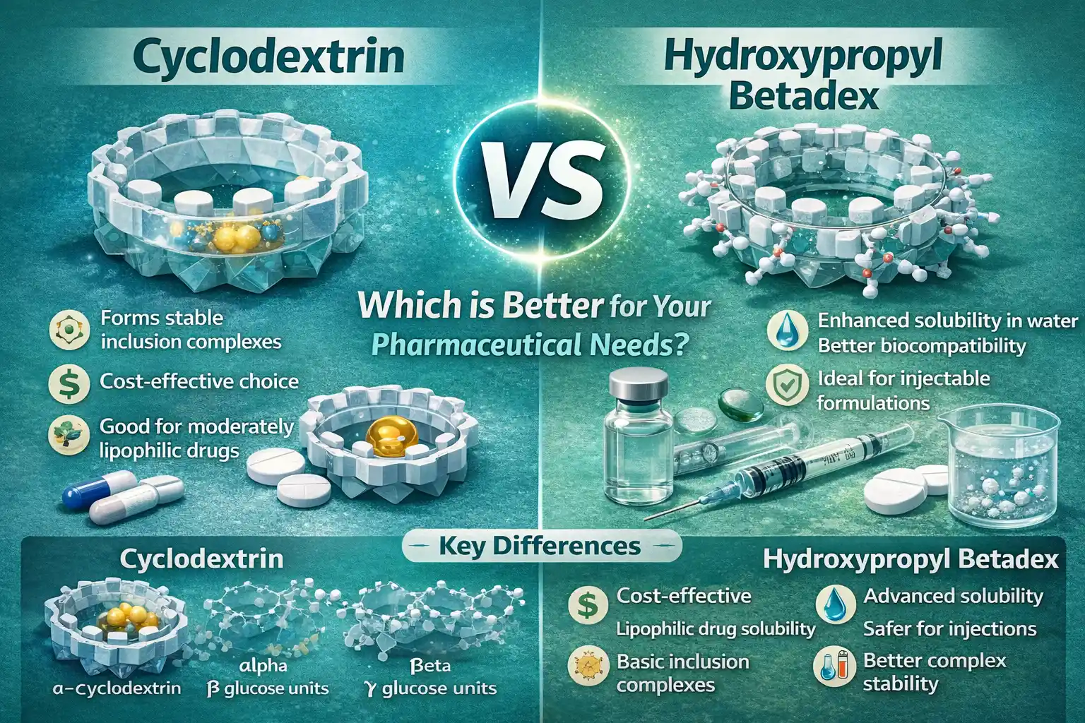 Nalika nerangake pharmaceutical nggunakake, cyclodextrin lanhidroksipropil betadexloro-lorone apik kanggo cara pangiriman obat kanthi cara dhewe. Siklodekstrin standar apik kanggo nutupi molekul lan biaya-efektif. Ing sisih liya, hydroxypropyl betadex luwih apik kanggo larut ing banyu lan luwih biokompatibel. Pilihan gumantung saka kabutuhan formulasi sampeyan, kanthi hydroxypropyl betadex nyedhiyakake peningkatan kelarutan kanggo molekul obat sing angel lan siklodekstrin sing unggul ing kompleks inklusi dhasar.